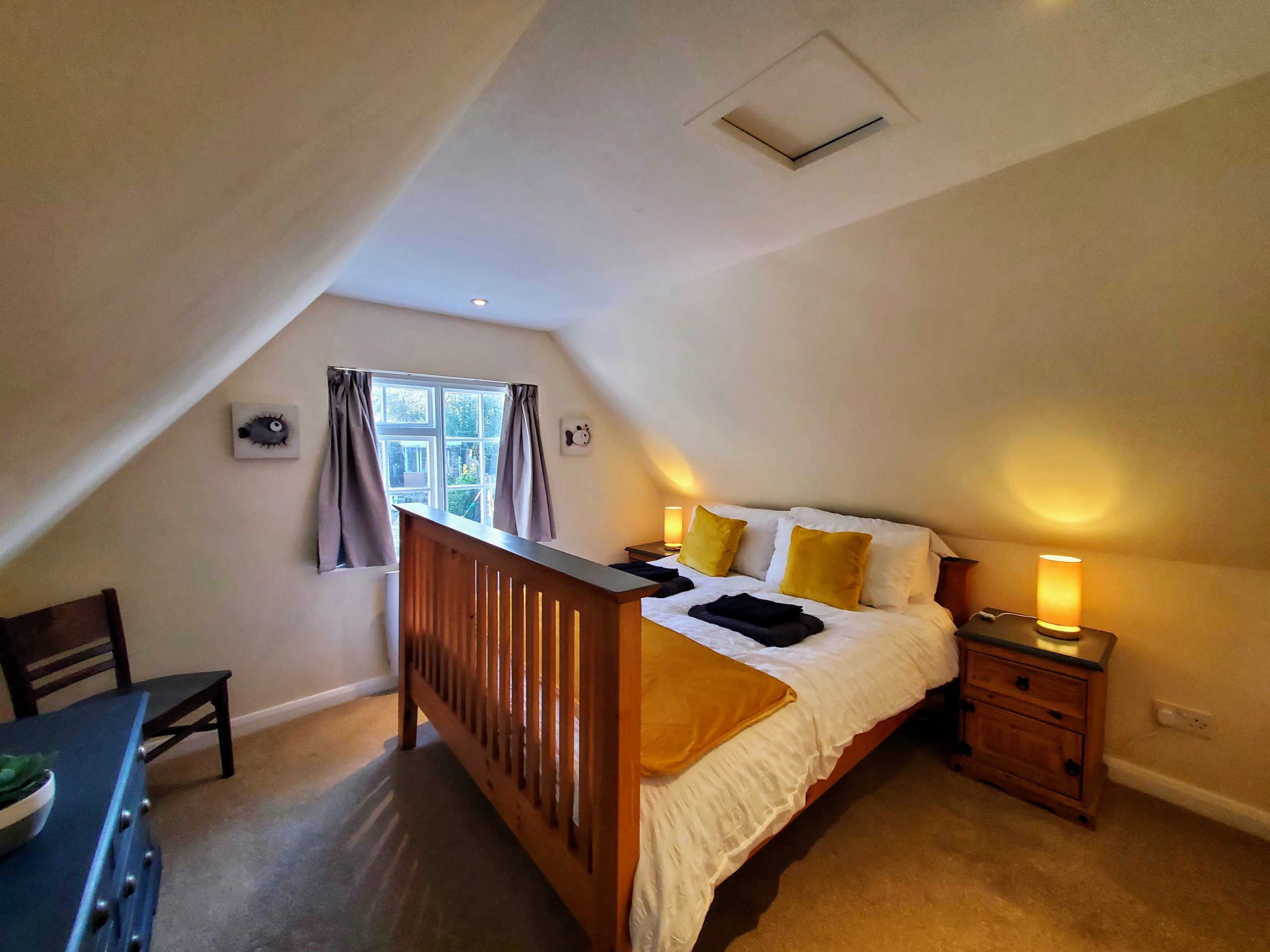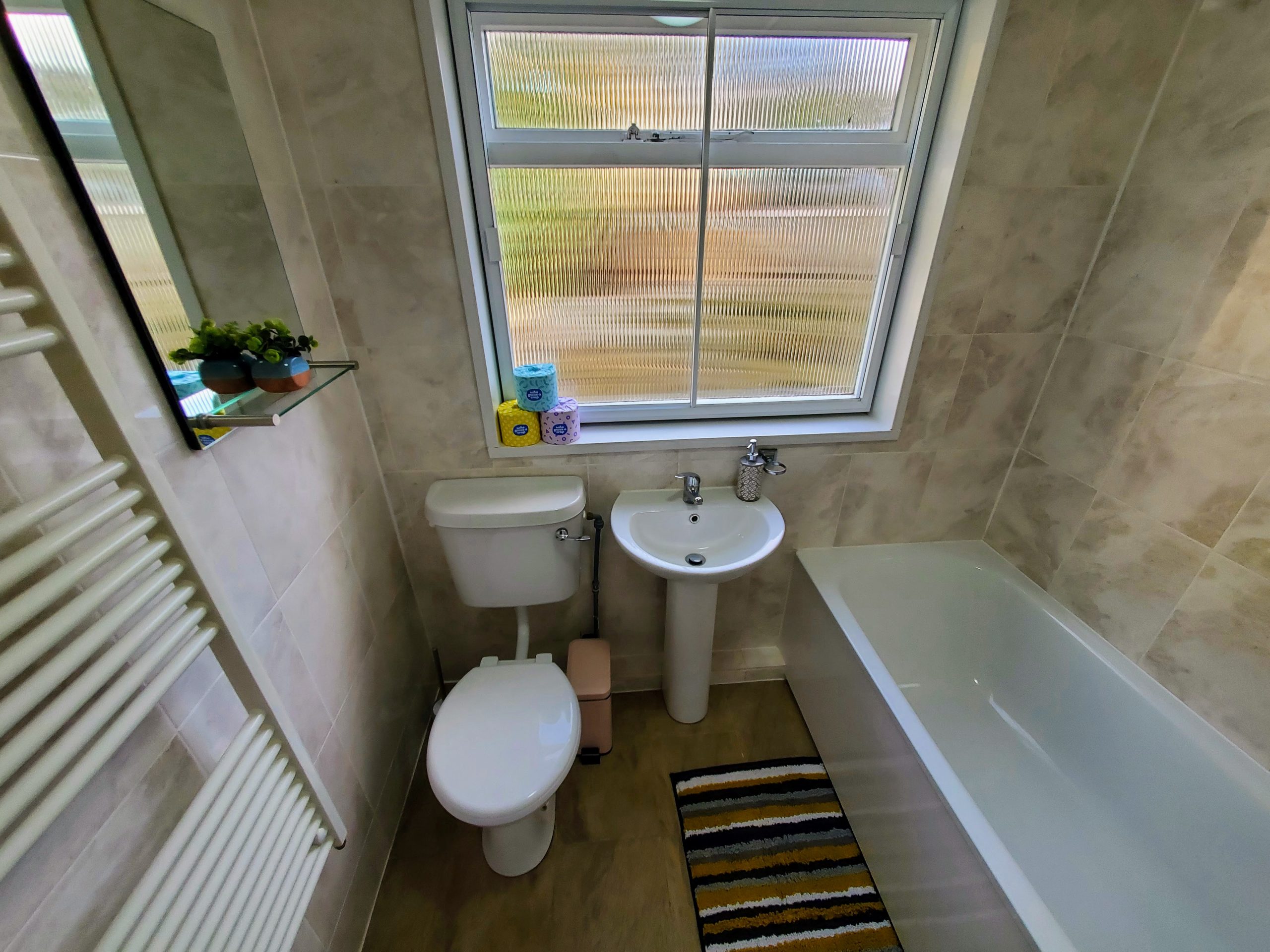 The ground floor’s spacious and homely open plan living area leads through to the bathroom (with a shower over the bath), then onto the enclosed rear garden.